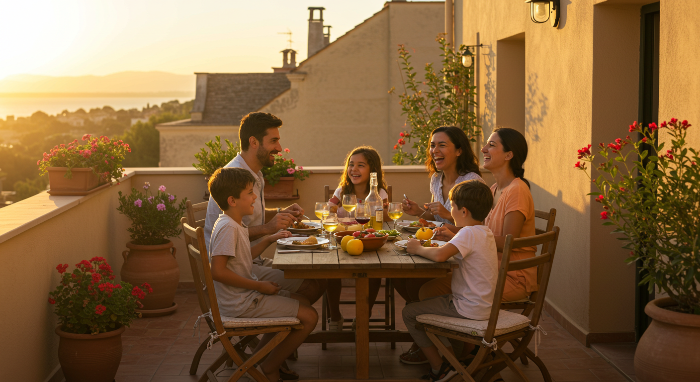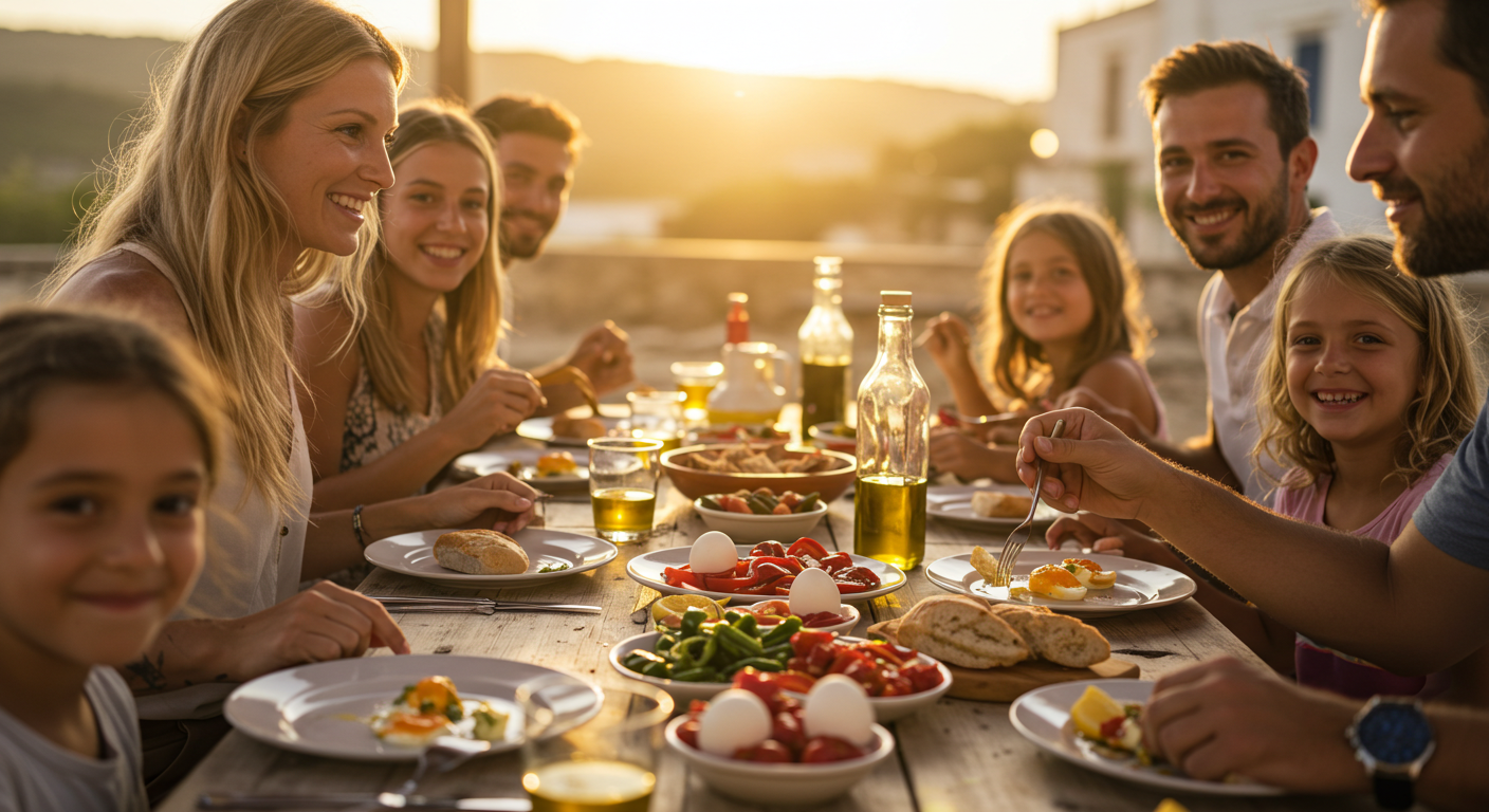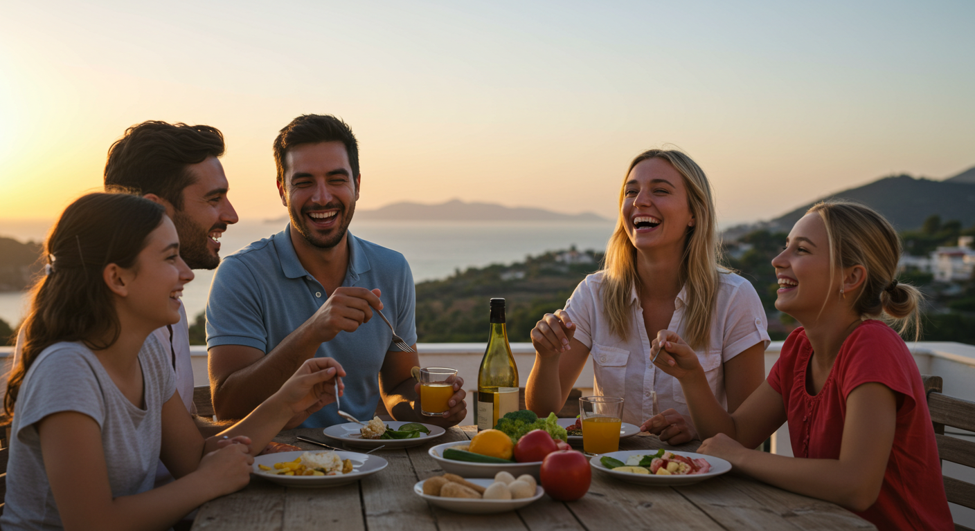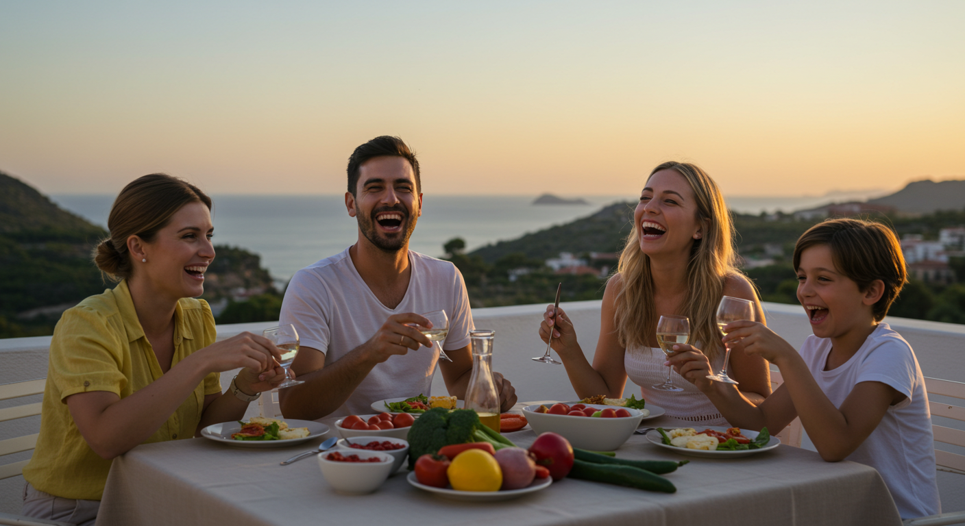 "가로 비율, 지중해 테라스에서 가족이 웃으며 함께 식사하는 감성적인 장면. 배경은 석양, 테이블에는 건강한 식재료가 놓여 있고, 따뜻하고 평화로운 분위기 강조."