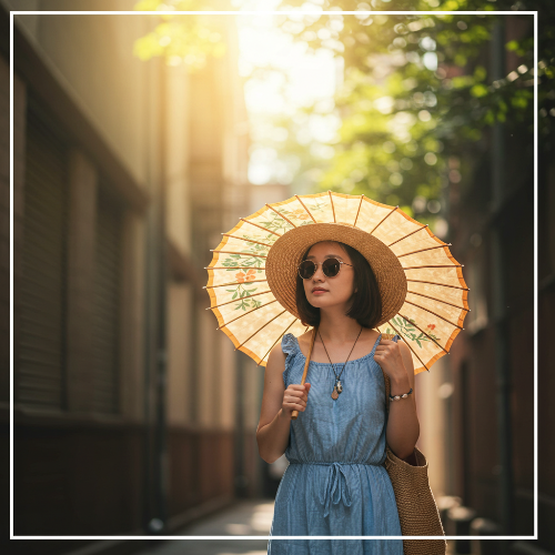 - 챙 넓은 모자, 밝고 헐렁한 옷 착용