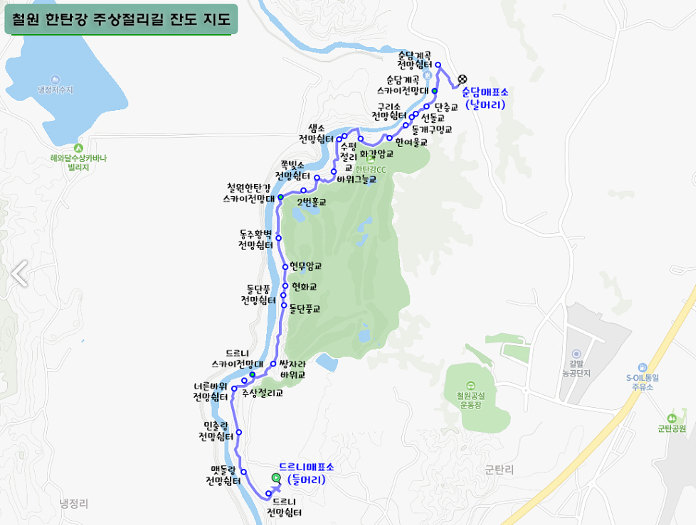 드르니 매표소에서 바로 출발하지 마시고, 드르니 전망쉼터에 들러서 먼저 경치를 감상해 보세요. 이곳에서 보이는 한탄강의 풍경은 정말 멋집니다. 아름다운 경치를 볼 수 있으며 여기서 사진 찍기에 좋을 것 같습니다