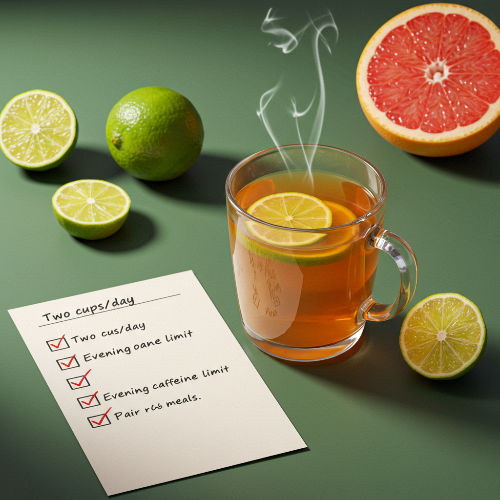 하루 예시 루틴(5가지): 아침 오트·그릭요거트에 냉침 베르가못 100ml 곁들이기, 점심 기름진 메뉴(버거·파스타)와 뜨거운 차로 식후 당류 갈망 줄이기, 간식 시간(15시) 아이스 베르가못+라임, 운동 30분 전 미지근한 차로 포만감 보조, 저녁 늦은 시간엔 무카페인 베르가못 블렌드로 수면 방해 최소화.