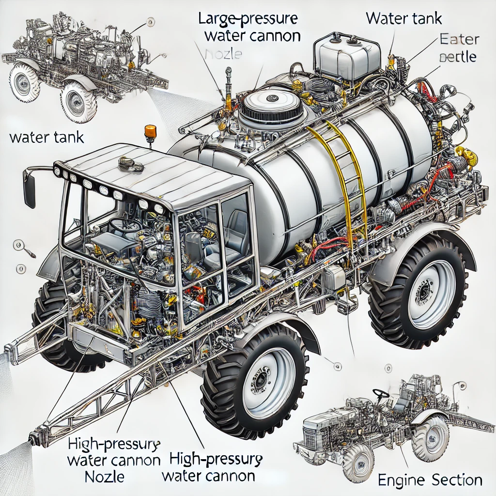 - 기계 구조: 고압 분사 장치와 대형 탱크, 전방 분사노즐 탑재