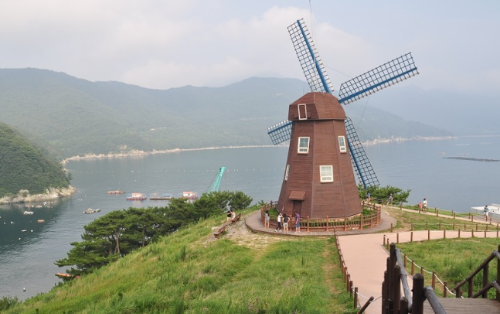 두 번째 날에 가기 좋은 곳입니다. 해금강으로 떠나는 유람선 선착장이 있는 도장포 항구에는 작은 언덕 하나가 바다를 향해 달려가듯 튀어나와 있습니다. 거제 8경 중 하나인 바람의 언덕이다. 동네에서 키우던 염소들이 뛰놀던 이름 없는 언덕이 바람의 언덕이라는 불리는 이유는 역시 바람 때문이다. 몸을 가누기 어려울 정도로 세차게 몰아치는 바람은 가슴속까지 후련하게 하는 매력이 있다 네덜란드 풍의 풍차가 있는 언덕에서 이국적인 분위기와 멋진 해안경관을 자랑합며 사진 찍기 매우 좋은 풍경입니다. 언덕 근처에는 바람의 핫도그, 피타맥, 미스터옥슈슈 등 맛있는 음식점도 있습니다.