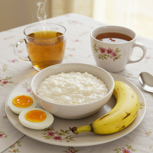 예시 메뉴 조합: - 흰죽 + 삶은 계란 - 바나나 + 플레인 요거트 - 토스트(무가공 식빵) + 삶은 감자 + 허브티