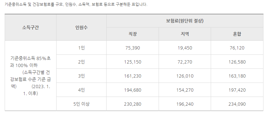 가구원수별 건강보험료를 기준으로 대상여부 판정 합니다. 기준중위소득 및 건강보험료를 규모, 인원수, 소득액, 보험료 등으로 구분해둔 표입니다. 소득구간 인원수 보험료(원단위 절상) 직장 지역 혼합 기준중위소득 85%초과 100% 이하 (소득구간별 건강보험료 수준 기준 금액) (2023. 1. 1. 이후)