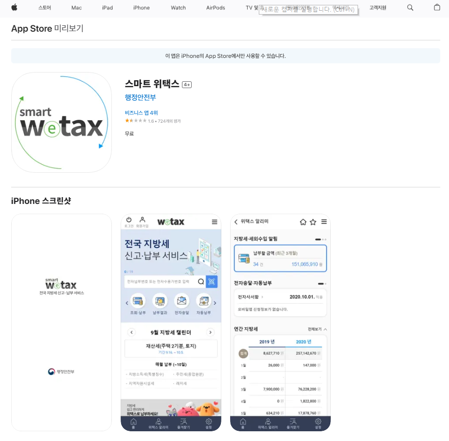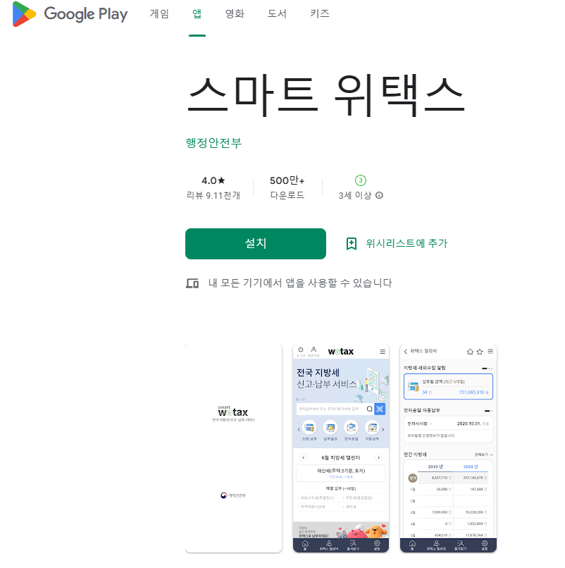 휴대폰으로 납부하려면 안드로이드폰 사용시 구글 플레이스토아에서 스마트위택스 앱을 다운로드하여 설치해야 합니다.