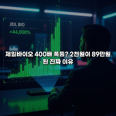 오늘의 주인공은 바로 '제일바이오' 입니다. 수치상으로만 보면 무려 400배(44,000%) 가 넘는 상승폭인데요. 주식 시장 10년 차인 저로서도 이런 숫자는 정말 오랜만에 봅니다. 도대체 밤사이에 무슨 일이 있었던 걸까요? 이게 진짜 '대박'일까요, 아니면 우리가 모르는 '착시 현상'일까요?