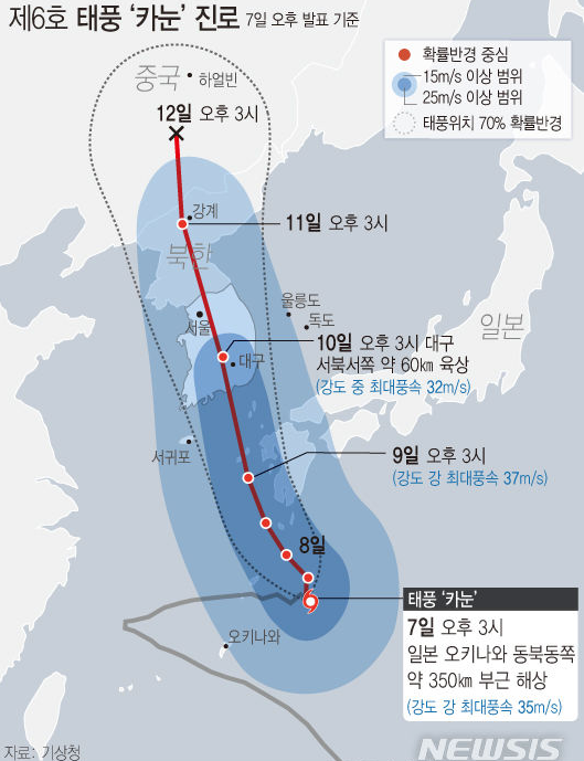 태풍 카눈의 예상 경로에는 변동이 있습니다. 당초 중국 상하이 남쪽에 상륙할 것으로 예상됐지만, 태풍의 이동 속도가 느려지고 주변 기압계가 바뀌면서 한반도 쪽으로 방향을 틀었습니다. 기상청은 태풍의 경로가 유동적이므로 발표되는 기상 정보를 수시로 참고해 달라고 당부했습니다. 태풍 눈의 북상으로 인해 세계스카우트연맹이 새만금 잼버리를 조기 철수하기로 결정했습니다. 잼버리 야영장은 태풍 카눈의 영향권에 들어갈 가능성이 있으므로, 참가자들의 안전을 위해 서울 등 수도권으로 숙소를 이동하거나 일찍 귀국할 수 있도록 조치할 예정입니다.
