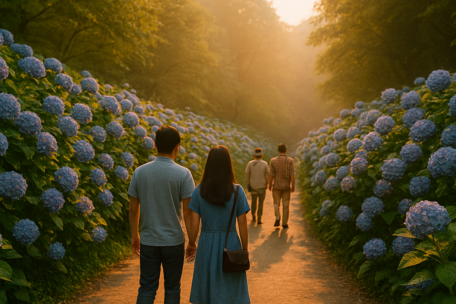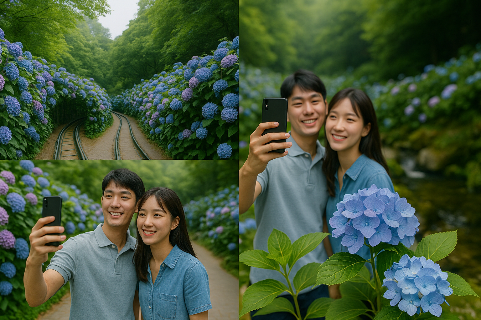 - 수국 터널: 꽃으로 둘러싸인 길에서 인물 중심 사진 찍기