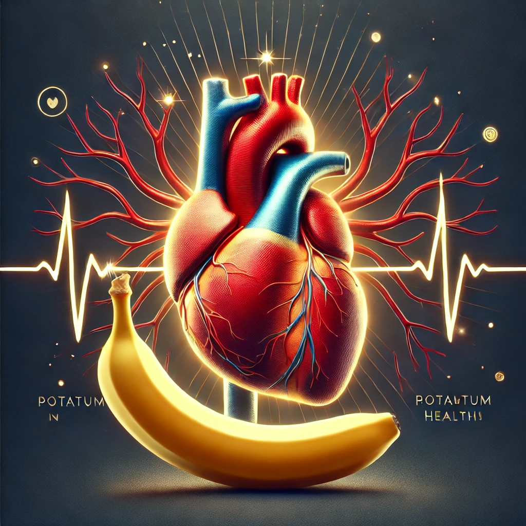- 심혈관 건강: Heart illustration with arteries and a banana beside it, symbolizing potassium effect.