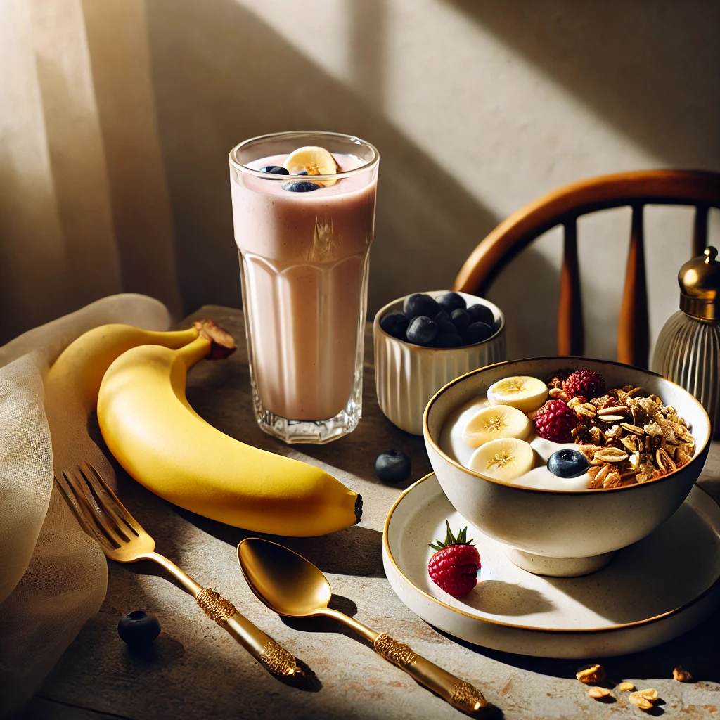 A breakfast table with a peeled banana, yogurt bowl, and a smoothie; bright morning sunlight, cozy and inviting.